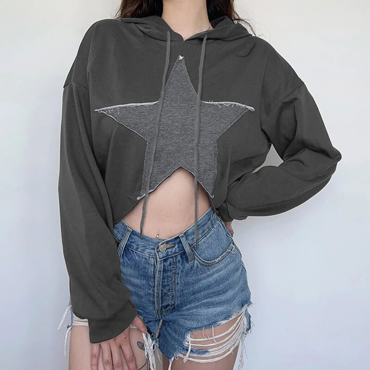 ゆったりとした服装がやせている女性のギャルの短いタイプの臍のカバーの頭の紐を引き出して帽子のシャツの5角の星まで布の刺繍の衛衣を貼ります。