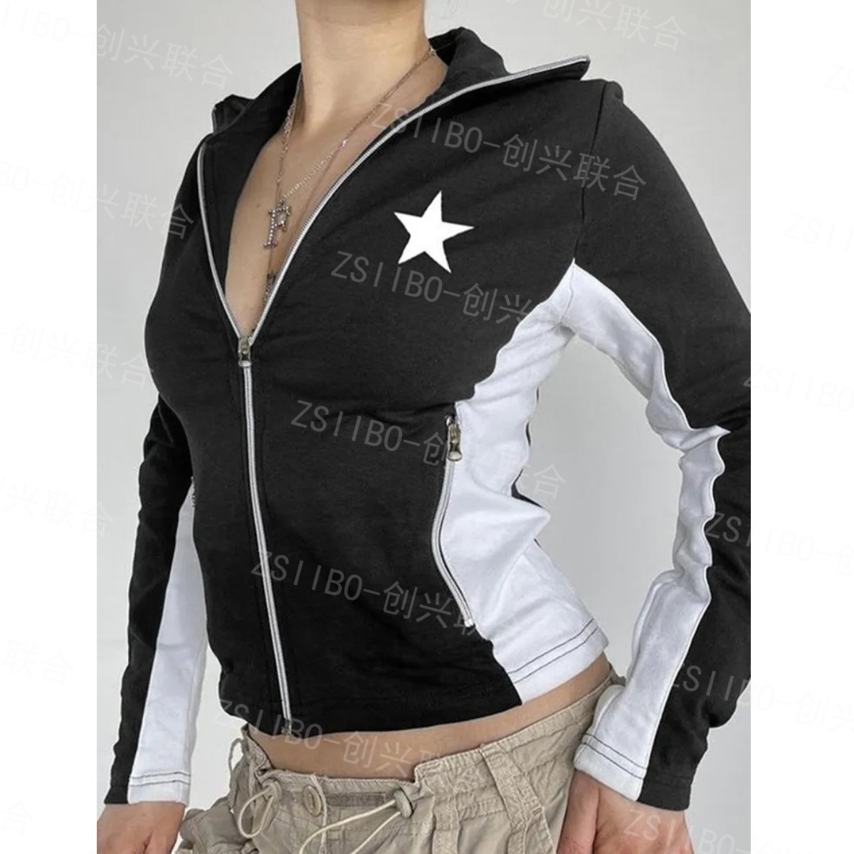 ギャルの上着のショートタイプの修身運動レジャー五角星の白黒はファスナーのコートをつなぎ合わせます。