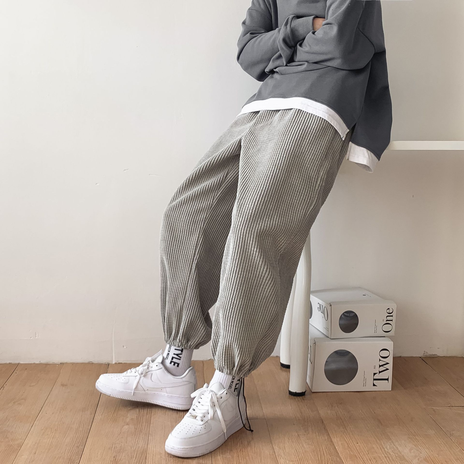 コーデュロイカジュアルパンツ男性秋の韓国版トレンドストレートゆるいワイドパンツ潮牌引きひも足スポーツパンツ