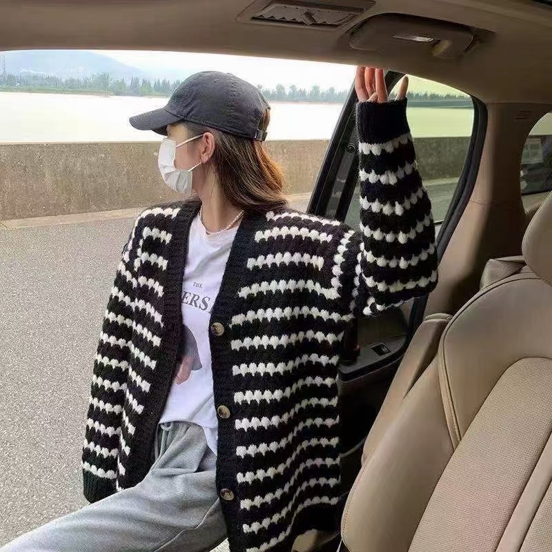 レトロなストライプの怠惰なセーターのカーディガンのコートの女装秋冬2022の新型のゆったりした外はvネックのニットを着ます。