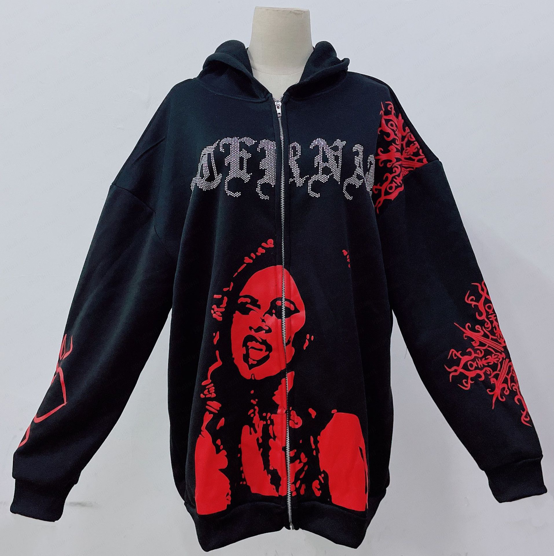 秋冬の新商品のファッションファッションの個性的な衛衣のファスナーと帽子の暗いロック風のプリントの衛衣のコート
