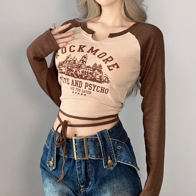 ギャルのレトロな建築のアルファベットのプリントのvネックは色のtシャツにぶつかります。