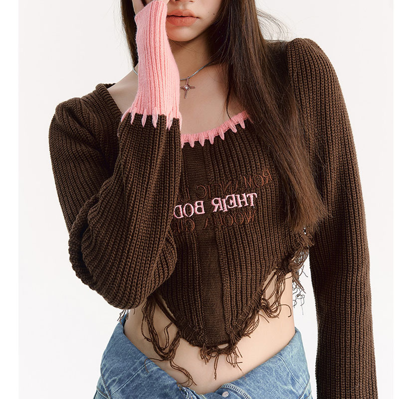 街頭で色の刺繍のセーターの女性の春の新型のギャルの甘い甘くて辛い短いタイプの方襟のメリヤスの上着の2022