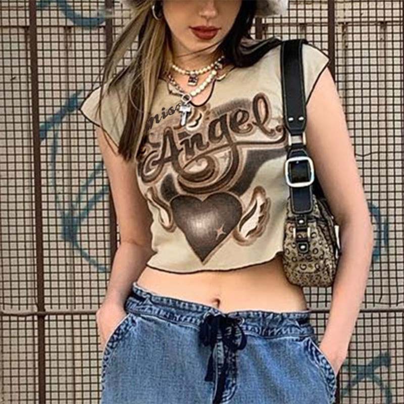 アメリカ2022新型個性は古いプリントの小さいtシャツの女性の短いタイプの頭をかぶせて身を修めて底のギャルの短い上着の女性を打ちます。