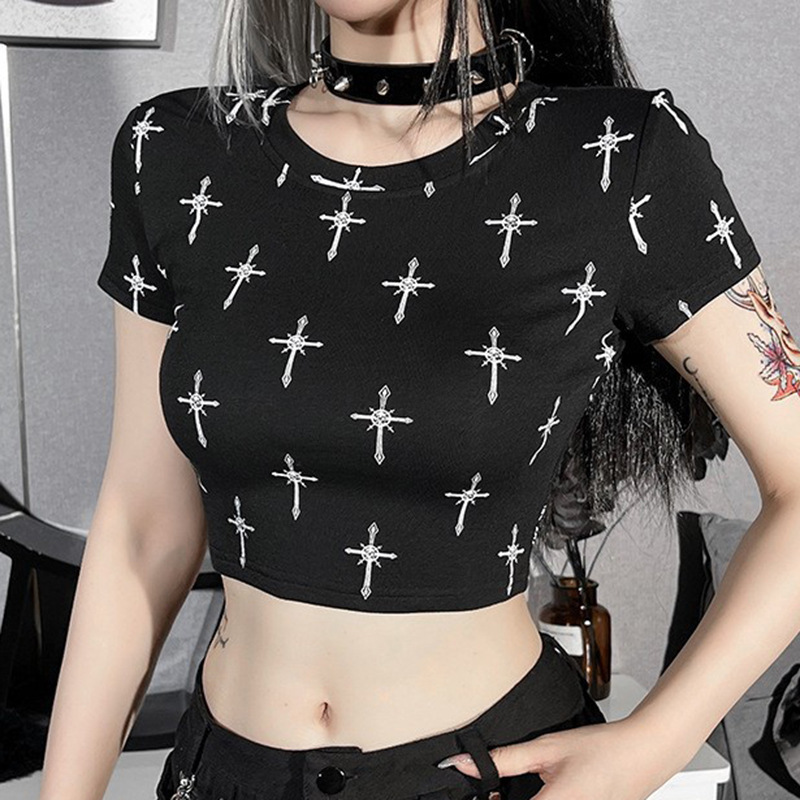 欧米の国境を越えた女装暗黒風クロスプリントtシャツ2022夏の新型ショート丈の修身上着の女性