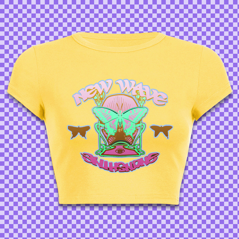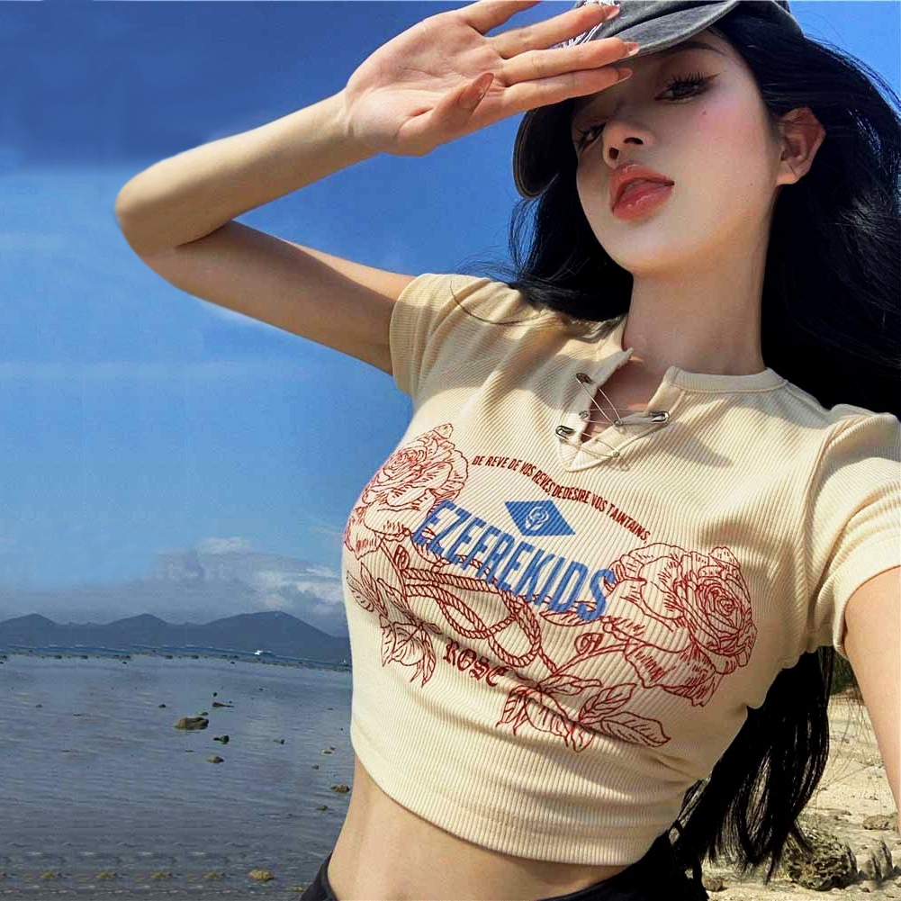 新型欧米の純色の街頭の原宿風のプリントの丸首の半袖の短い金のへその百合のtシャツの婦人服