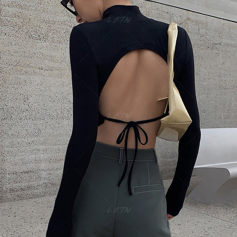 大露背ストラップ長袖上着女2022夏新作欧米ファッション気質半高襟修身ショートtシャツ