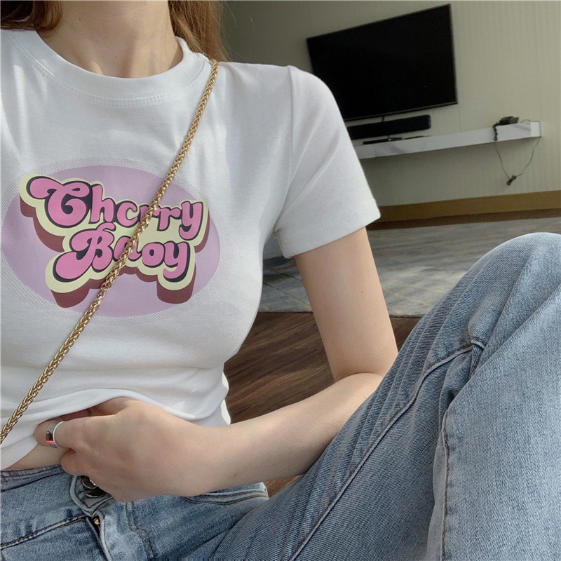 2021年春夏新作丸襟アルファベットプリント白色半袖底付きシャツtシャツ上着女装ins潮