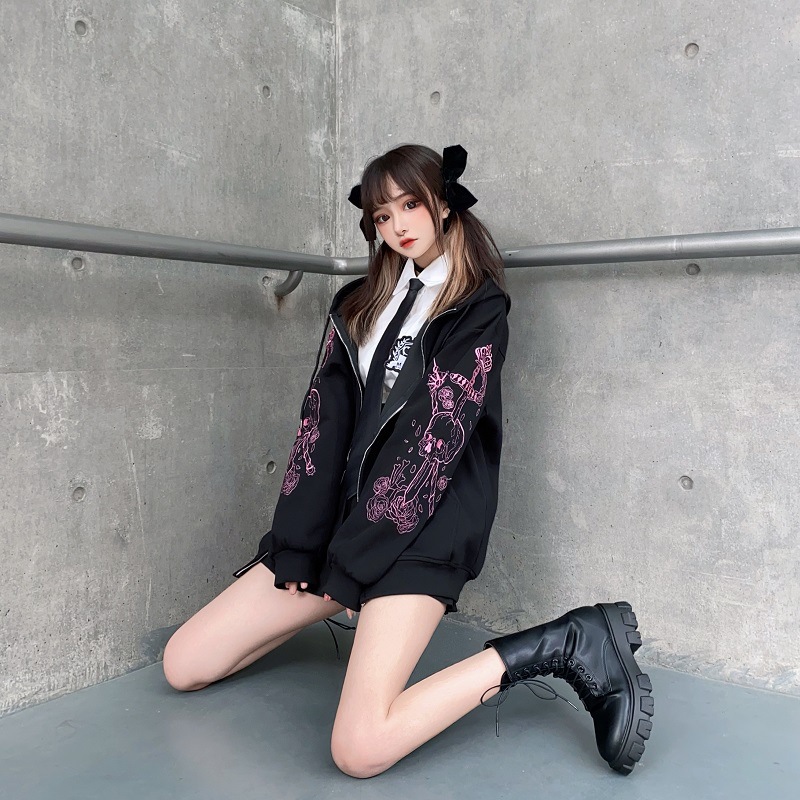 2022新型22年秋の新型帽子付きカーディガン女性のゆるい頭蓋プリントファスナー長袖コート潮
