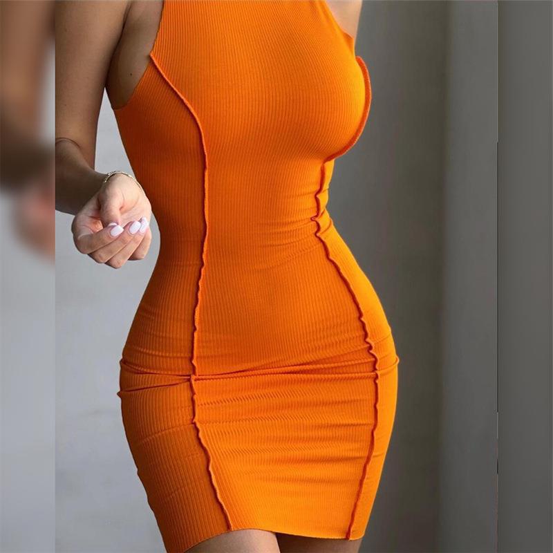 2021欧米風夏の新型女性丸首袖なし反車辺純色潮人修身包尻ワンピース女