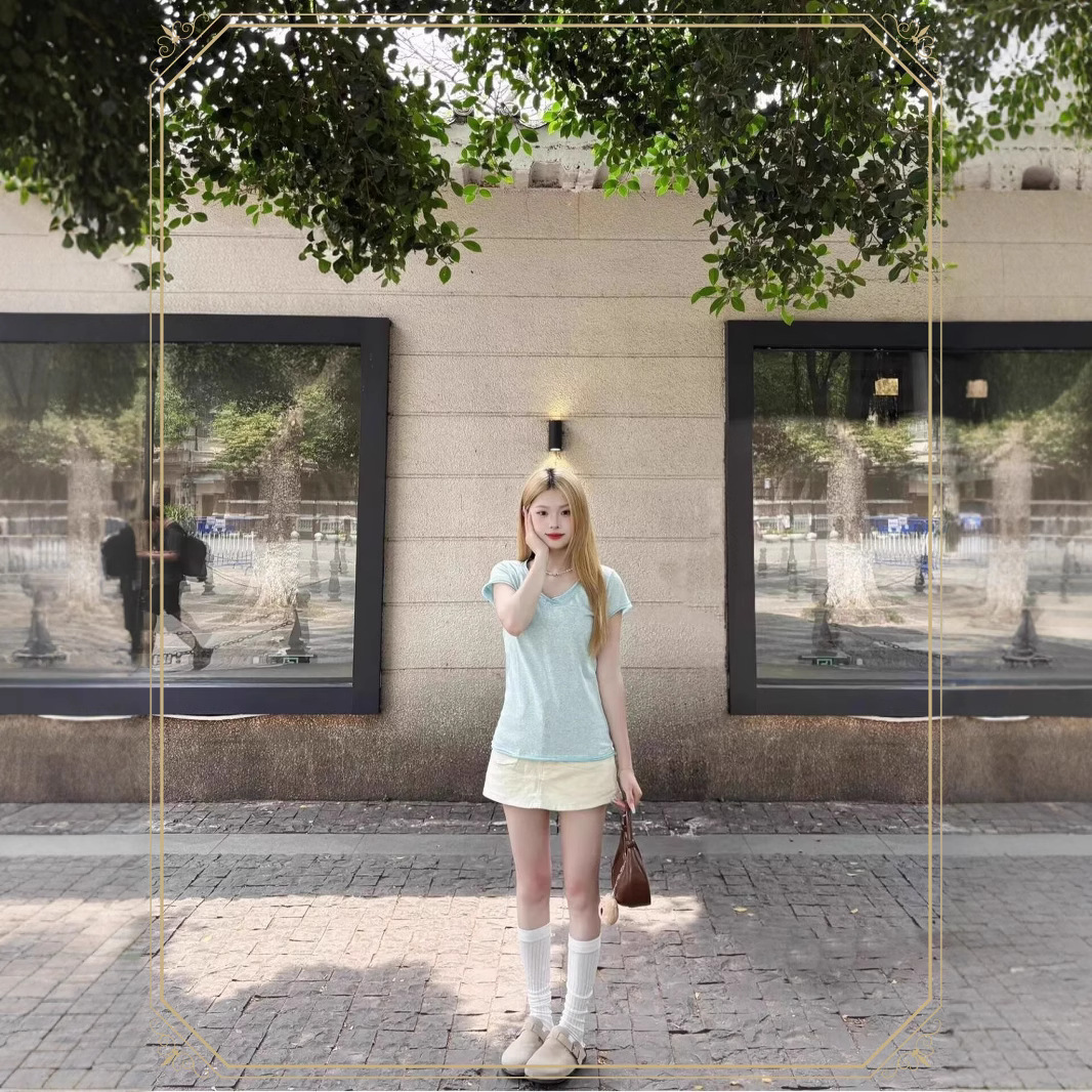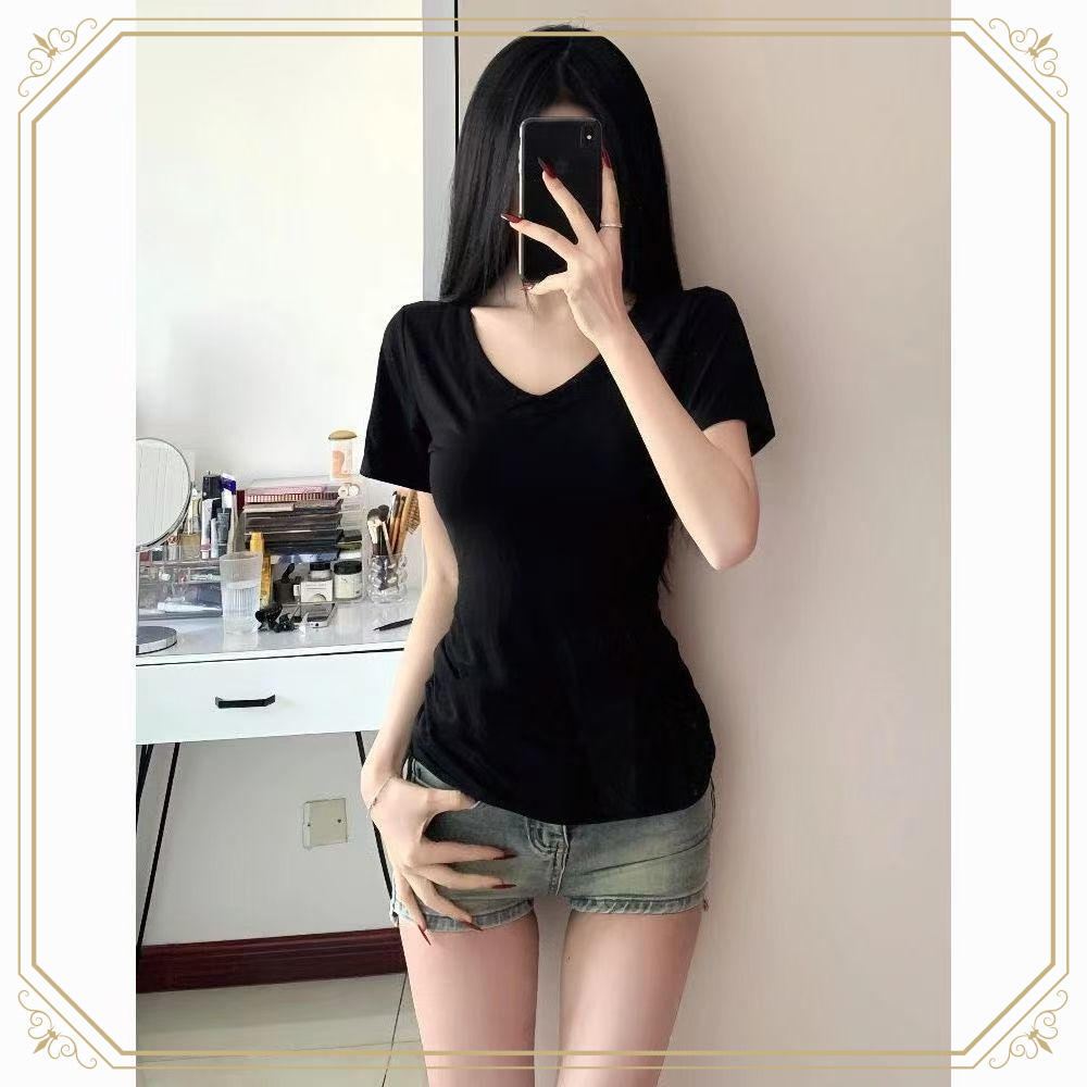 韓国風シンプル無地Vネックトップス半袖Tシャツレディース2025夏人気スリムフィット伸縮性万能鎖骨アウターウェア