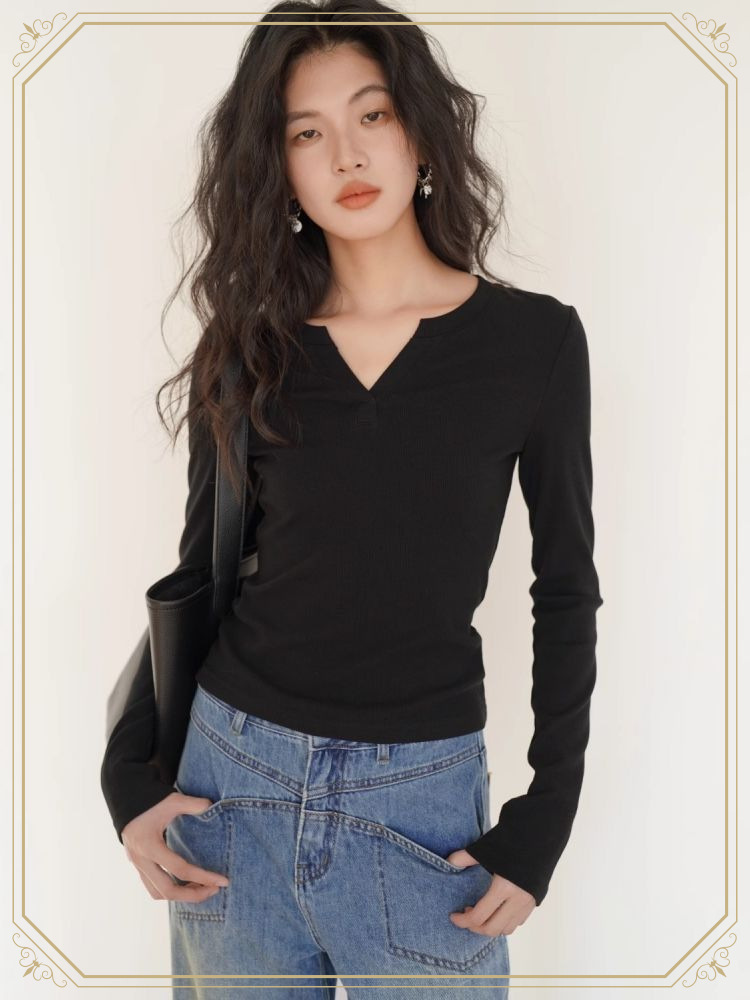 アメリカンブラック右肩ボトリングシャツVネック長袖2024春秋新作無地スリムフィット万能トップス