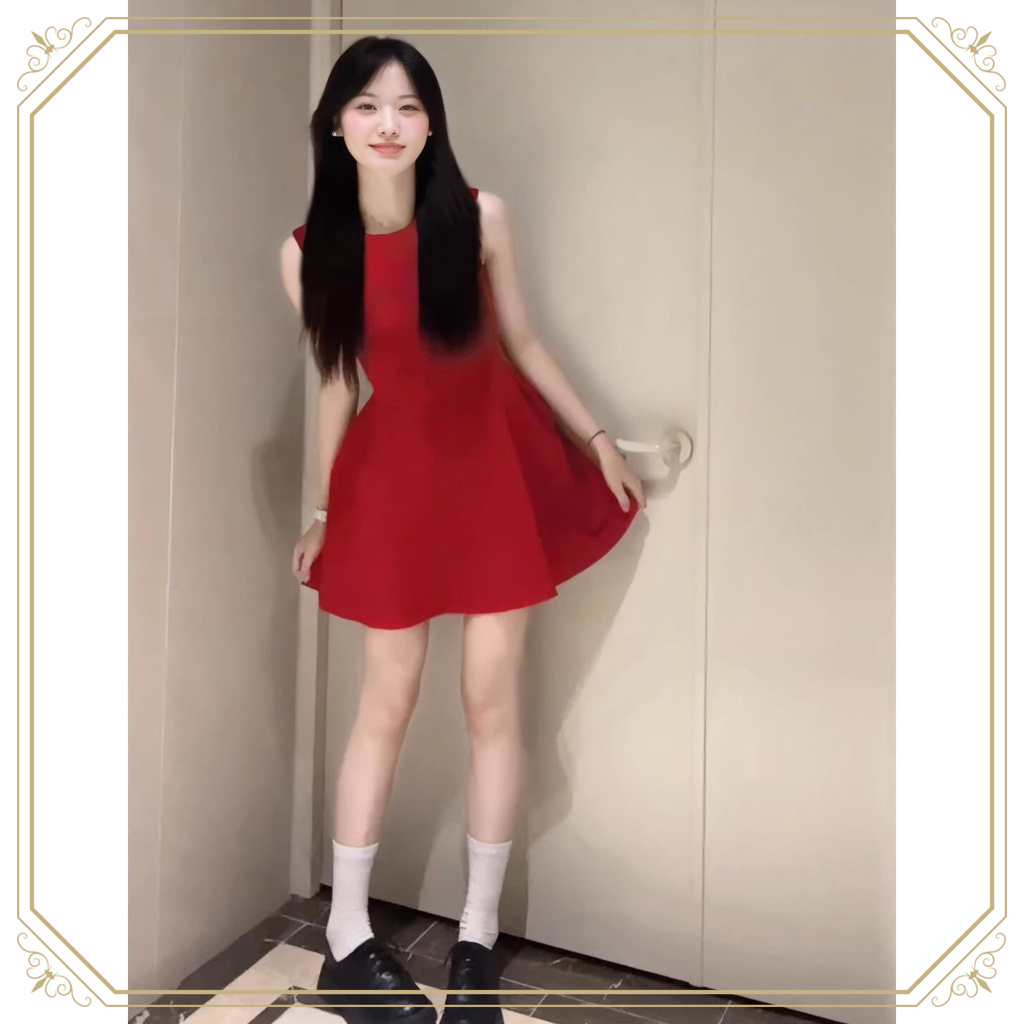 赤いドレスウエストAラインノースリーブショートスカート女性小柄ドーパミン着用夏美しい小さな赤いスカート