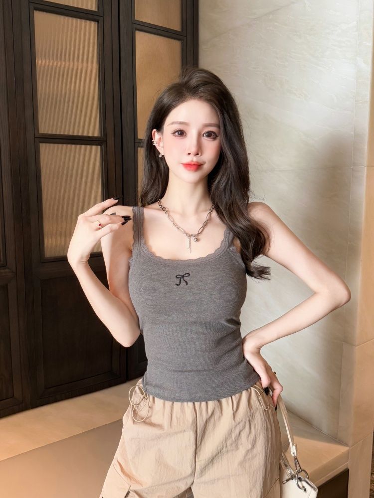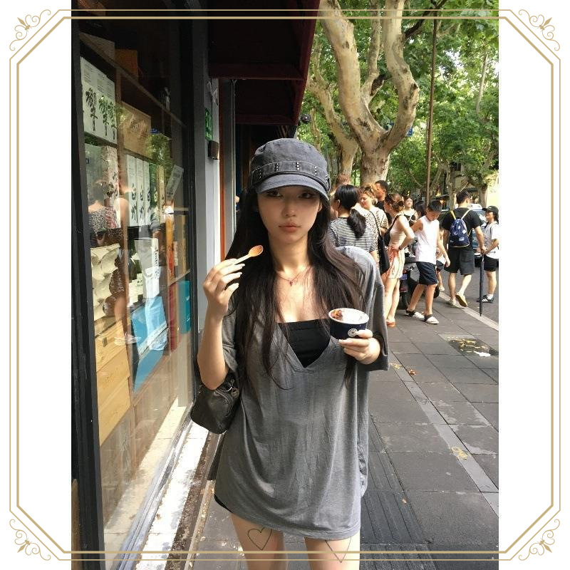 3MER Oh Oh Sanmei グレー スクエア ラウンドネック フロントショルダー 半袖 Tシャツ レディース 夏 レイジー ルーズ スリム ホットガール トップ