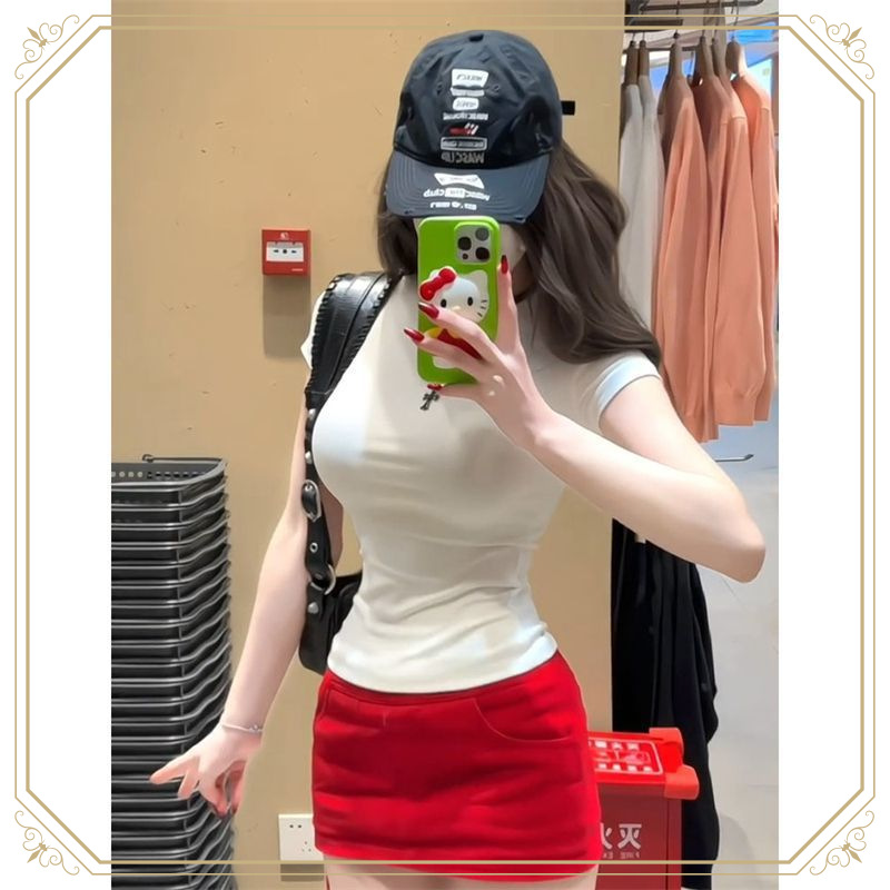 アメリカンホットガールホワイトショルダーウエストラウンドネック半袖Tシャツレディース夏スリムフィットタイトショートトップトレンディ