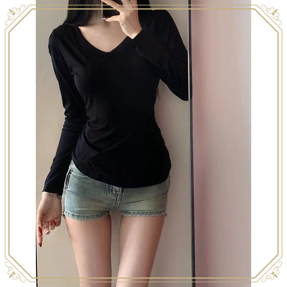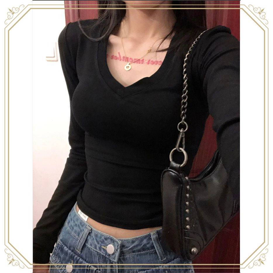 ホットガールブラックアメリカンピュアディザイア長袖レディースVネックショルダーTシャツ新作スリムフィット秋スリムトップウエストボトム