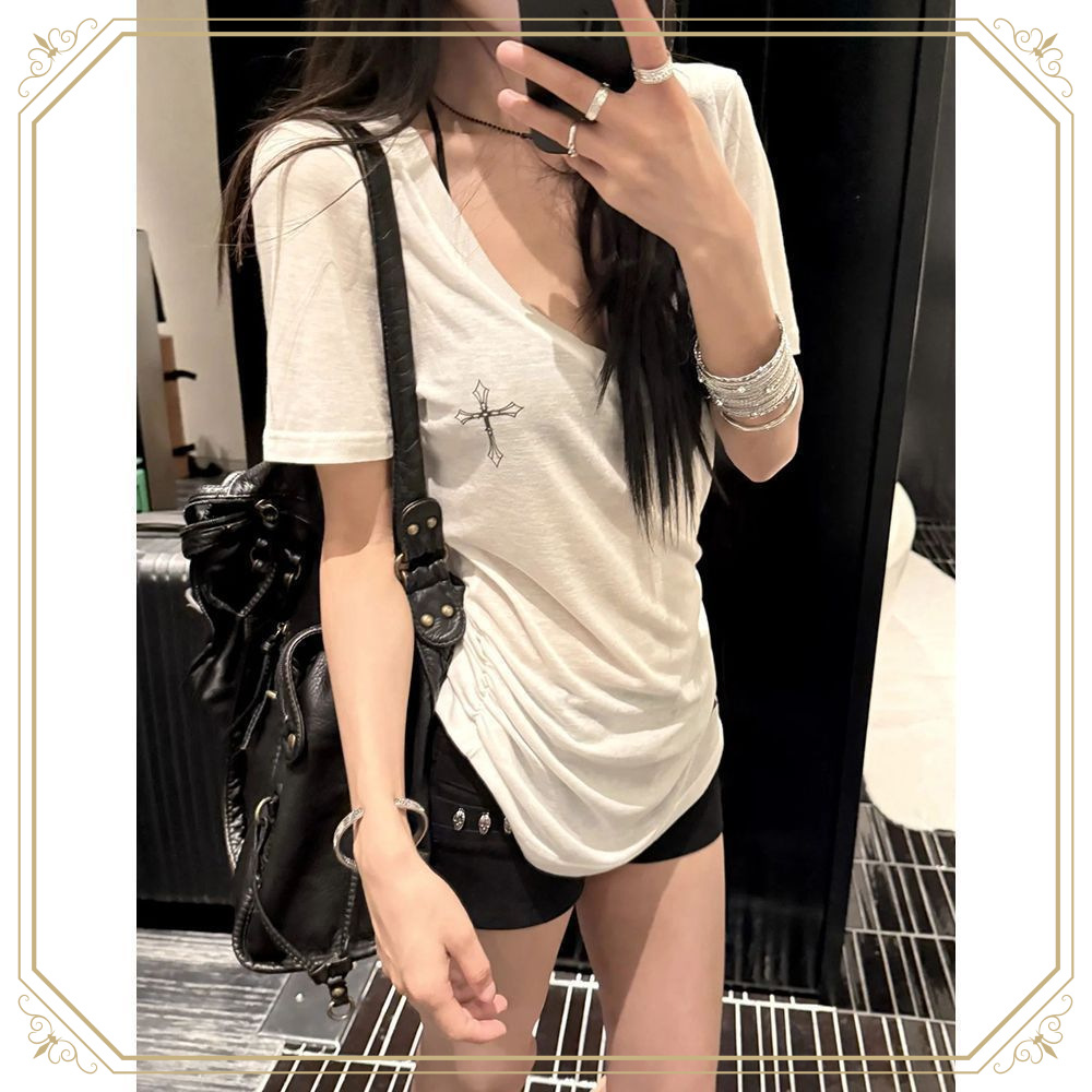 デザインされたスクエアネック、右肩半袖Tシャツ、女性用夏気質ニッチピュアディザイアホットガールスリムフィットショートトップ