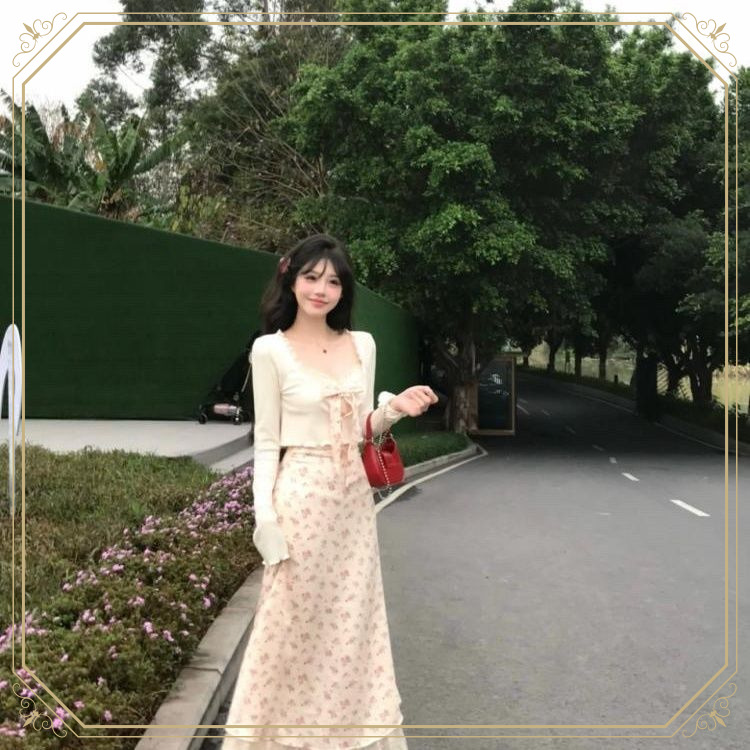 霧の花の海 春夏 ウエスト痩身 ピュアセクシースタイル スイートフローラルサスペンダードレス+カーディガン レディースツーピーススーツ