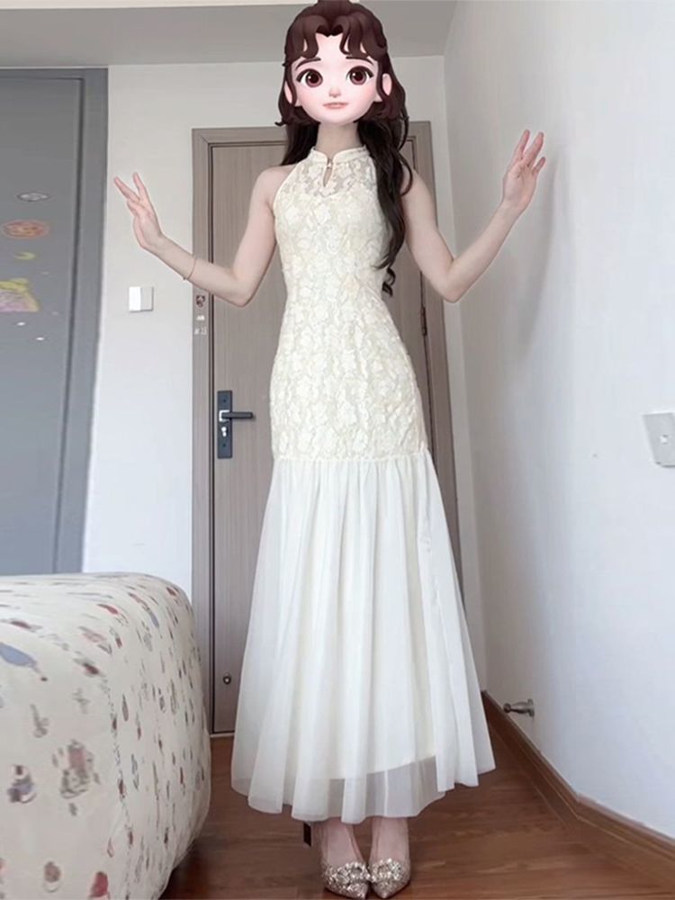新しい中国風の白いジャカード改良されたチャイナドレスクールなメッシュウエスト気質ロングスカート女性の夏