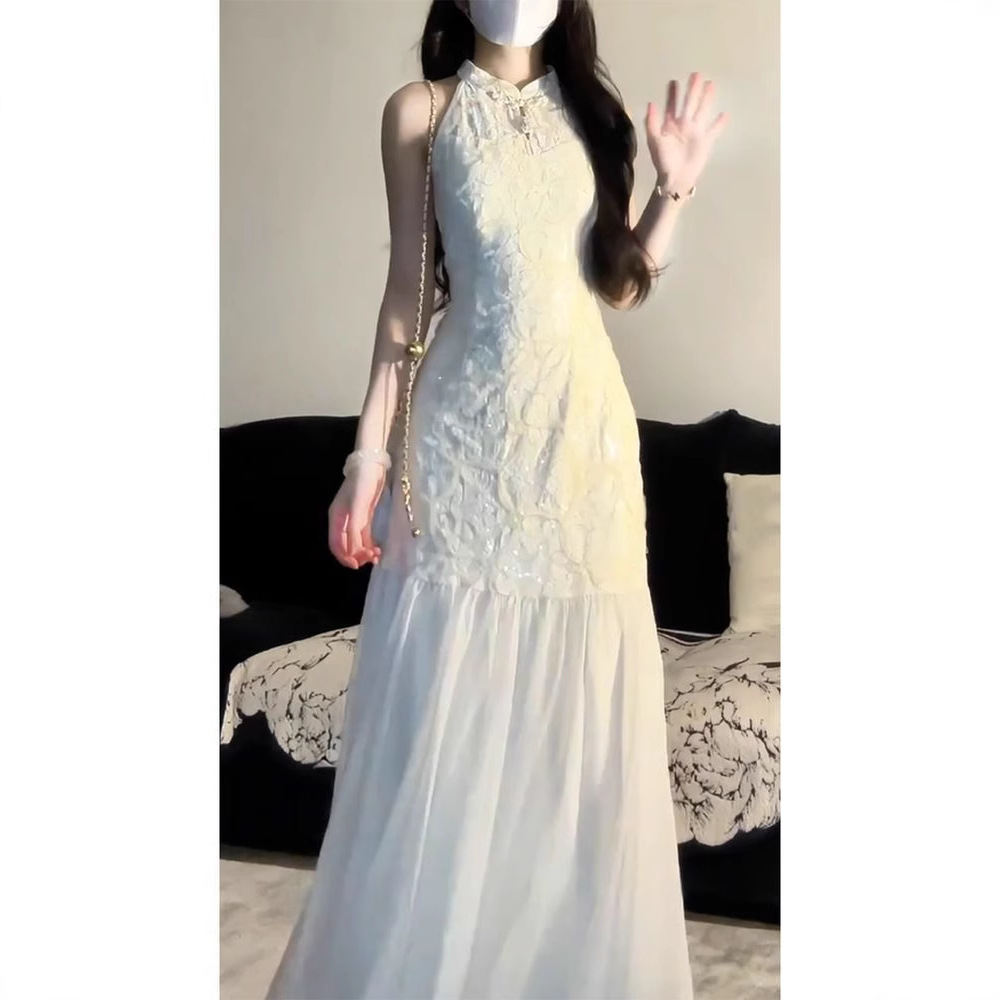 新しい中国風のクールで優しいホルターネックドレス、ハイエンドの絶妙なジャカード中空エッセンスウエストメッシュロングスカート