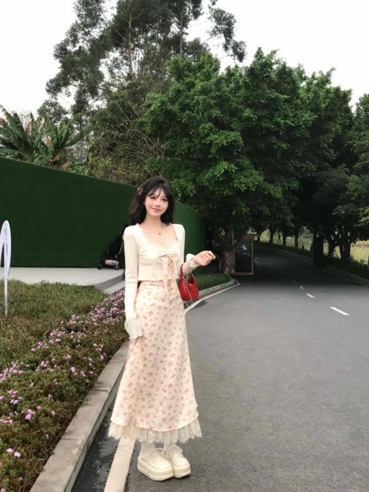 霧の花の海 春夏 ウエスト痩身 ピュアセクシースタイル スイートフローラルサスペンダードレス+カーディガン レディースツーピーススーツ