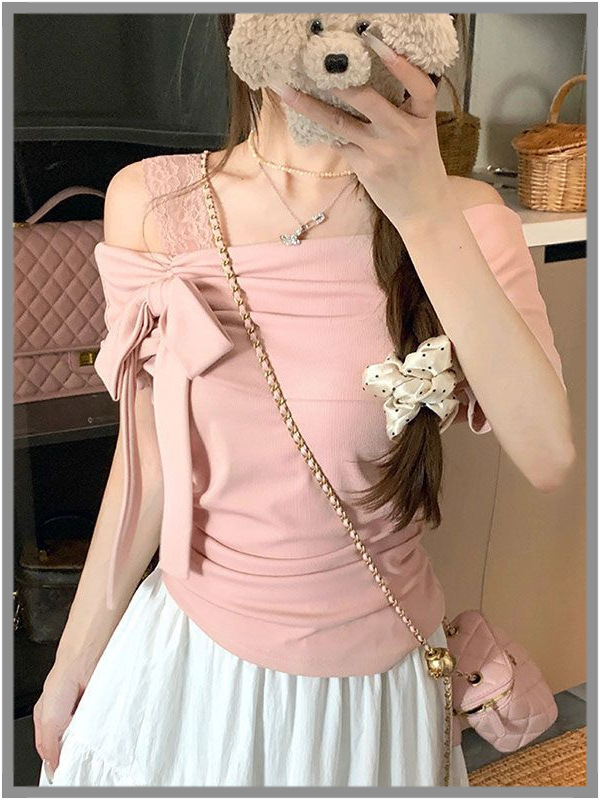 新しい夏のニッチピュアラスタイレーススプライシングリボンワンショルダー半袖シャツ女性の夏の甘いスタイルトップ