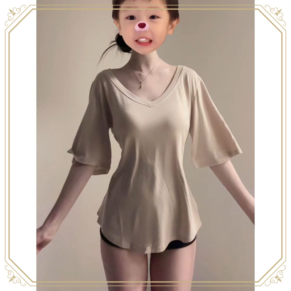 Vネックホットガールウエスト5分袖白半袖Tシャツレディース夏スリムルーズピンチウエストデザインニッチトップ