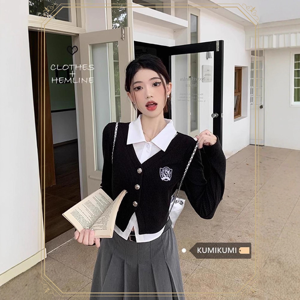 春と秋の女性のためのデザインされた偽ツーピース長袖ポロカラーシャツ黒のスプライシングショートスリムカレッジスタイルトップ
