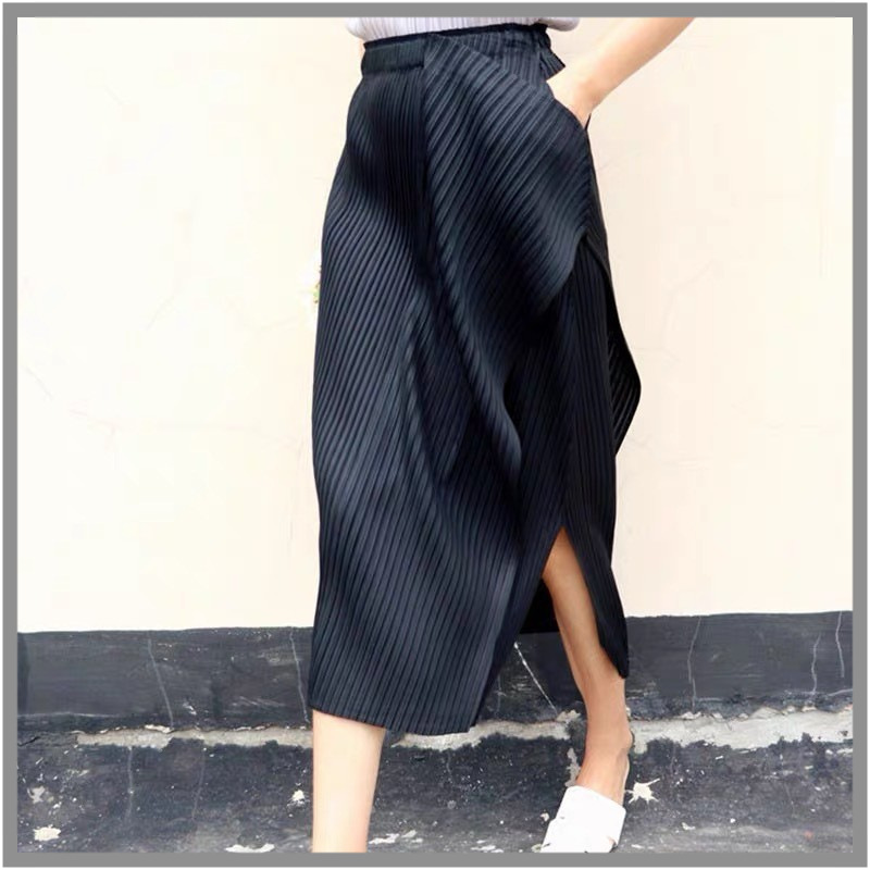 新しいヨーロッパとアメリカの非対称デザイン片面裾スリット三宅プリーツシリーズ女性用建築スタイルスカート