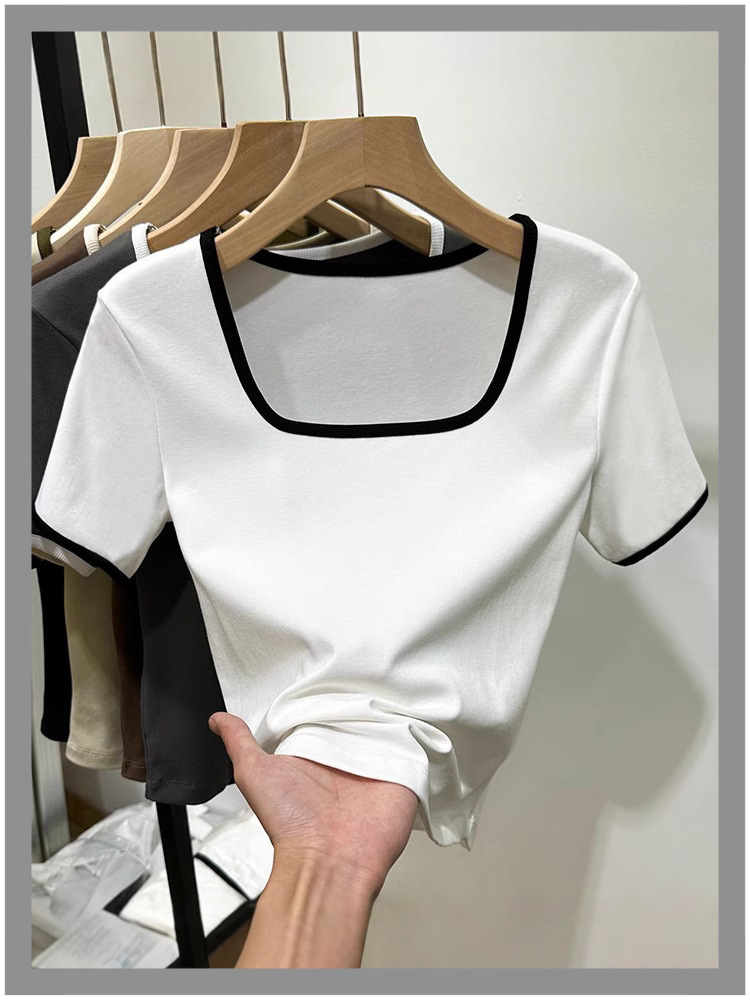 新しい黒のシャツの女性の半袖スクエアカラー新しい夏アメリカンコントラストカラーニッチデザインボトム多用途トップ