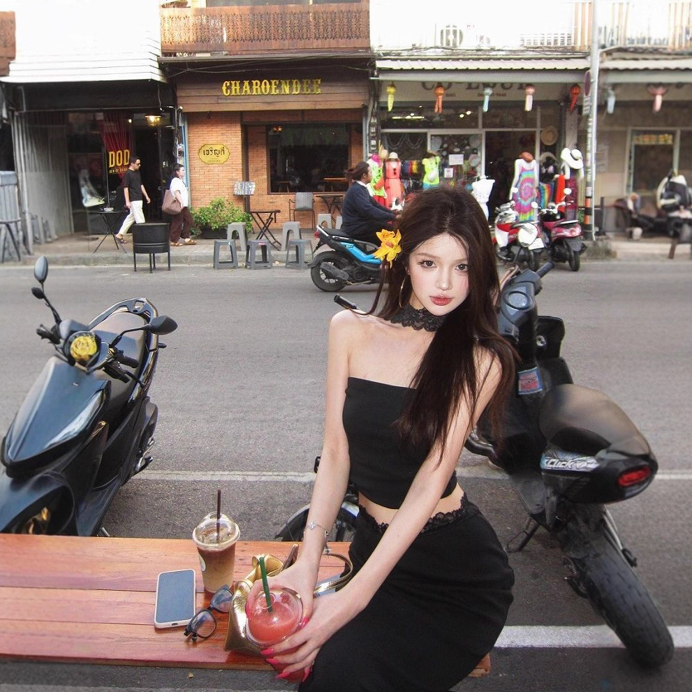 レースステッチホットガールホルターネックチューブトップ女性の夏のデザインスーツヒップカバースカート黒ツーピースセット