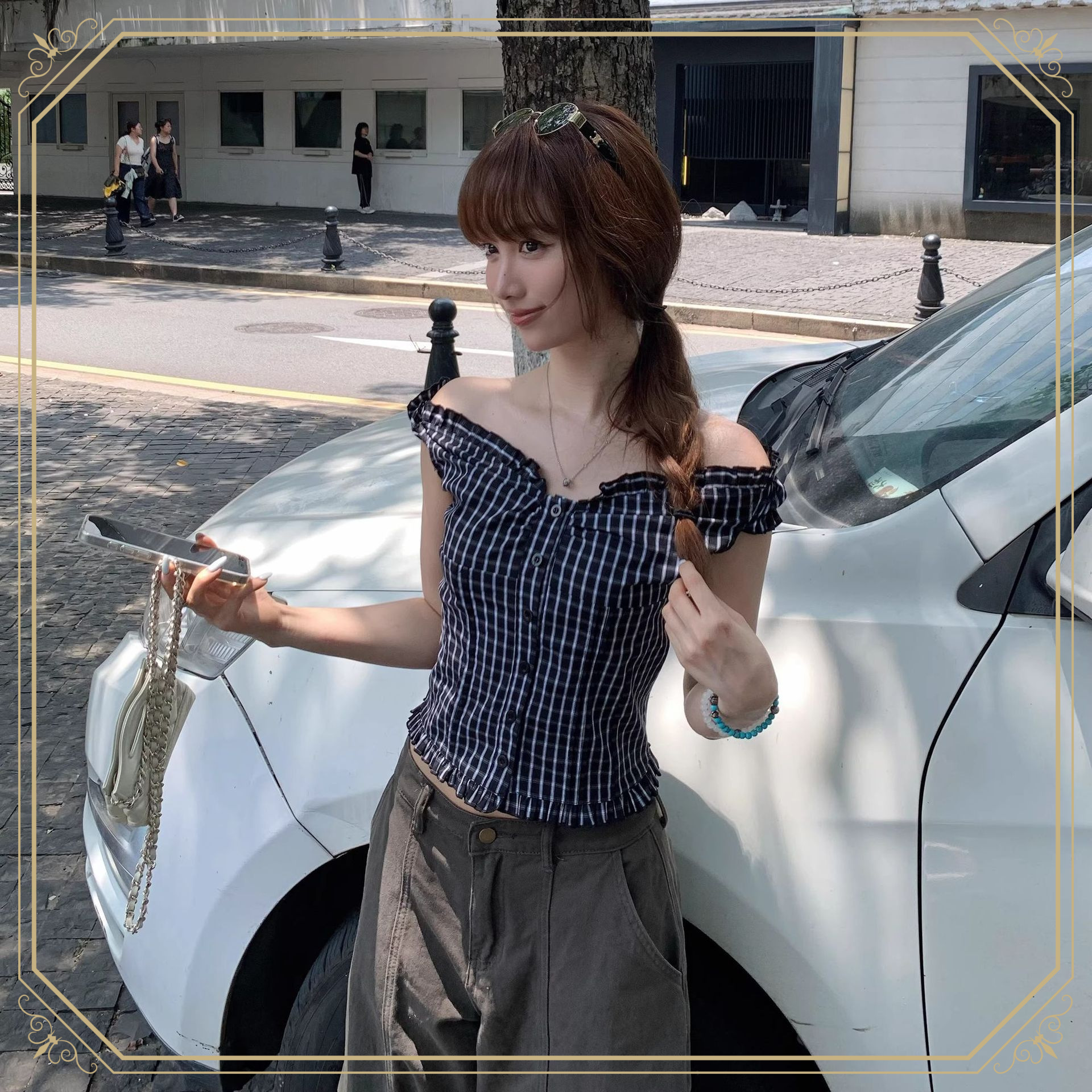 韓国レトロな黒と白のチェック柄ワンショルダーツーウェアオフショルダーシャツベスト女性の夏多用途甘いホットガールスリムトップ