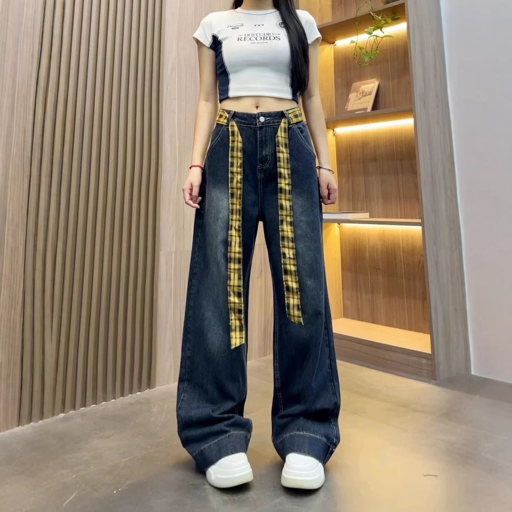 アメリカンレトロチェック柄スプライシングストラップジーンズ女性の夏の新しいルーズスリムハイウエストストレートワイドレッグパンツ