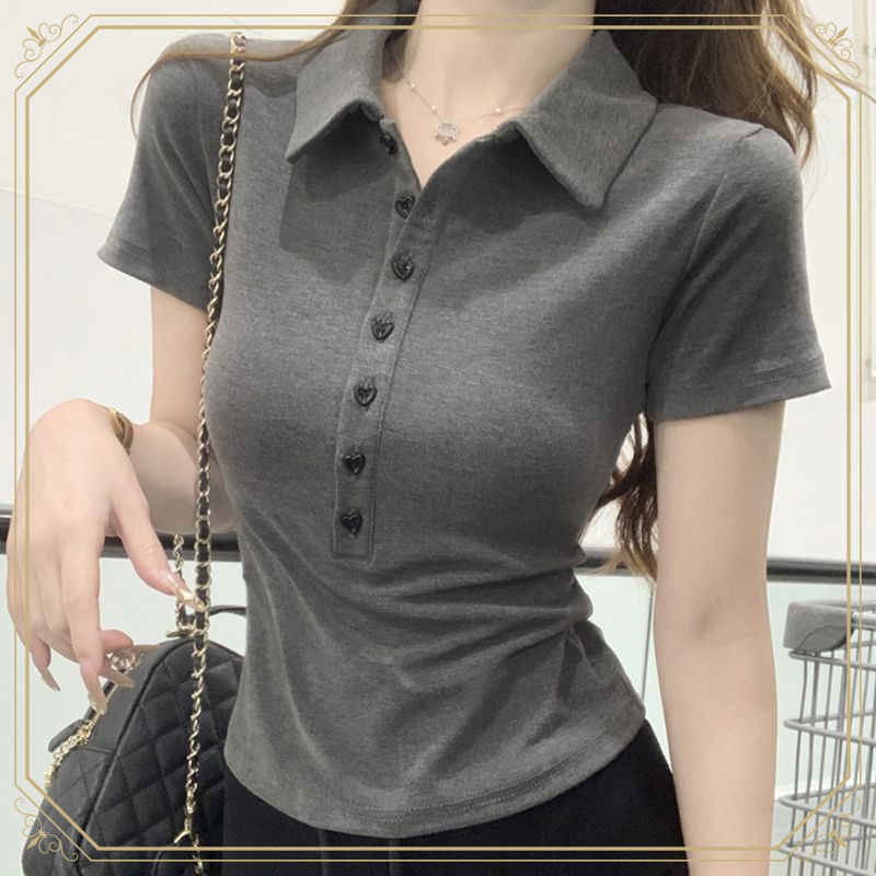 アメリカンスタイルの右肩グレーポロカラー半袖Tシャツ、女性用夏用ピュアコットンスリムフィットラペルシックトップ