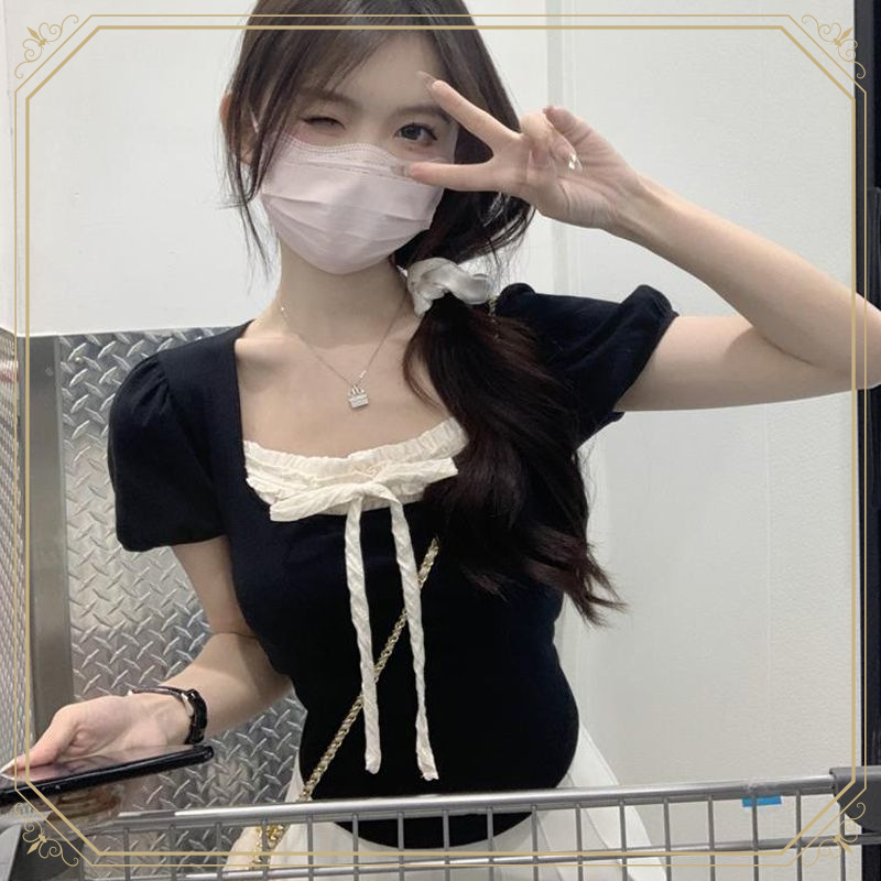 セクシーな純粋な欲望 V ネックレーススプライシング半袖 T シャツ女性の夏のハイエンドニッチホットガールスリムショルダーショートトップ