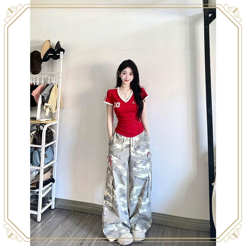 アメリカンVネックショルダートップスポーツスタイル半袖レディース夏ホットガールスリムフィットデザインレッドショートTシャツ