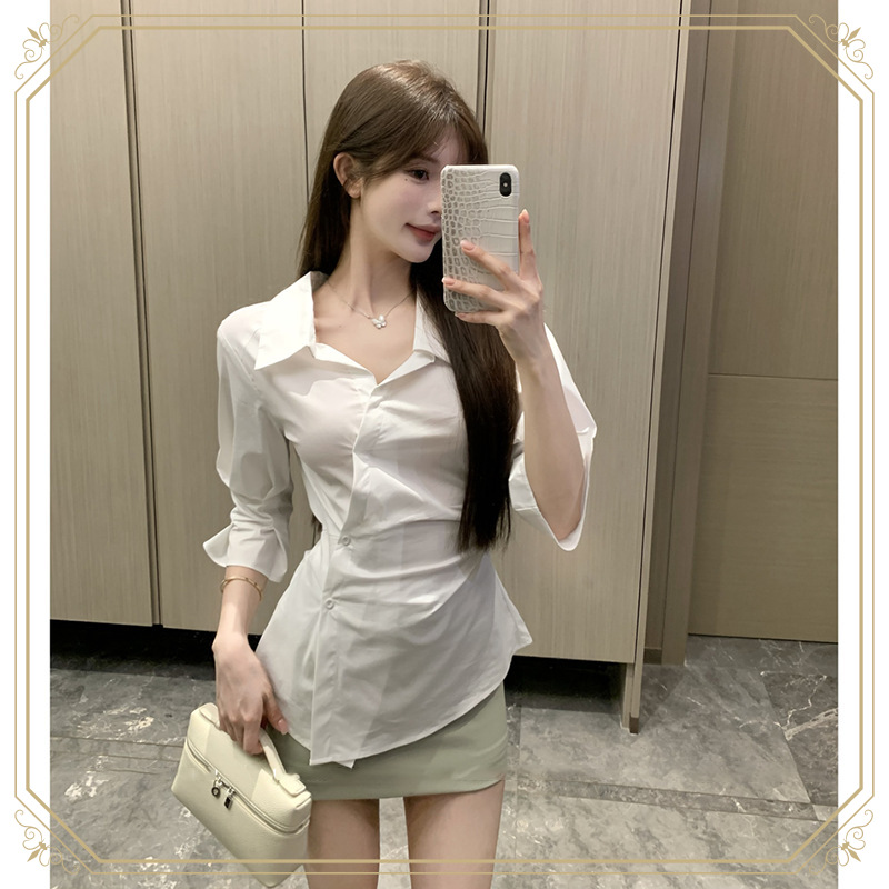 女性用の白いウエスト不規則なポロカラーシャツ、夏のデザイン、ニッチでシックで美しいシャツ、ホットガールトップ
