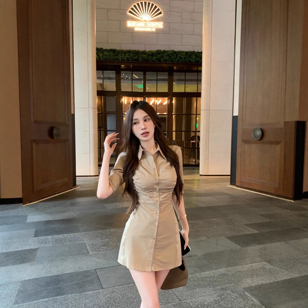 気質ブラウンポロカラー長袖シャツドレス女性の夏のプリーツホットガール痩身ウエスト A ラインショートスカート