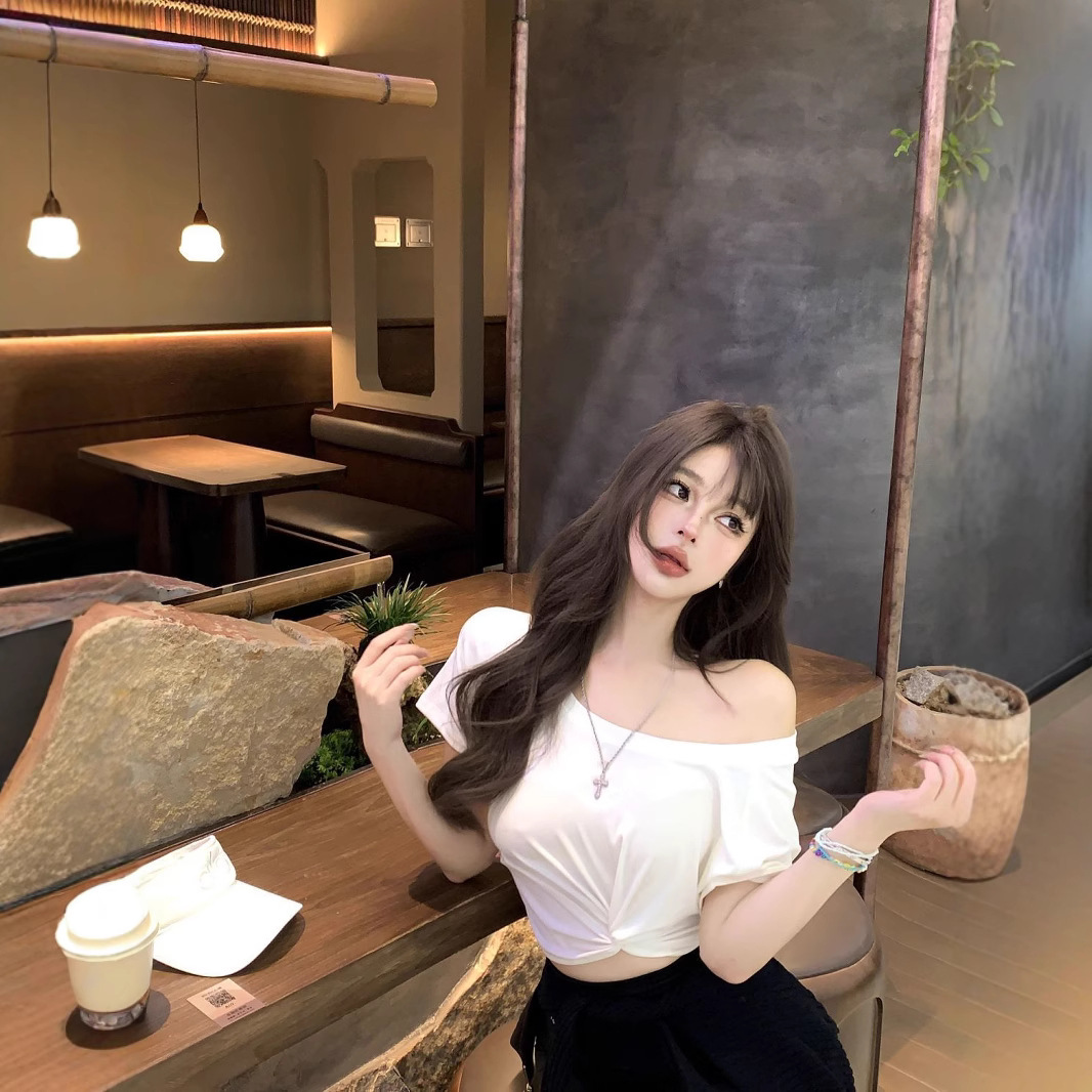 スラントネックオフショルダー半袖Tシャツレディース夏ホワイトホットガールスタイルセクシーツイストウエストショートトップブラックグレー