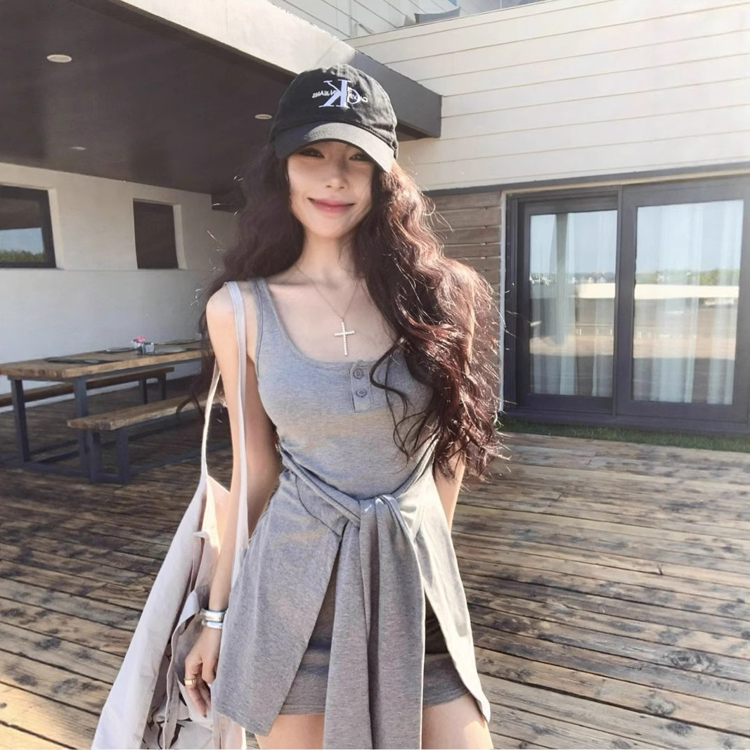 偽ツーピースストラップグレーサスペンダードレス女性の夏スリムホットガールショートスカート胸パッドウエストバッグヒップスカート