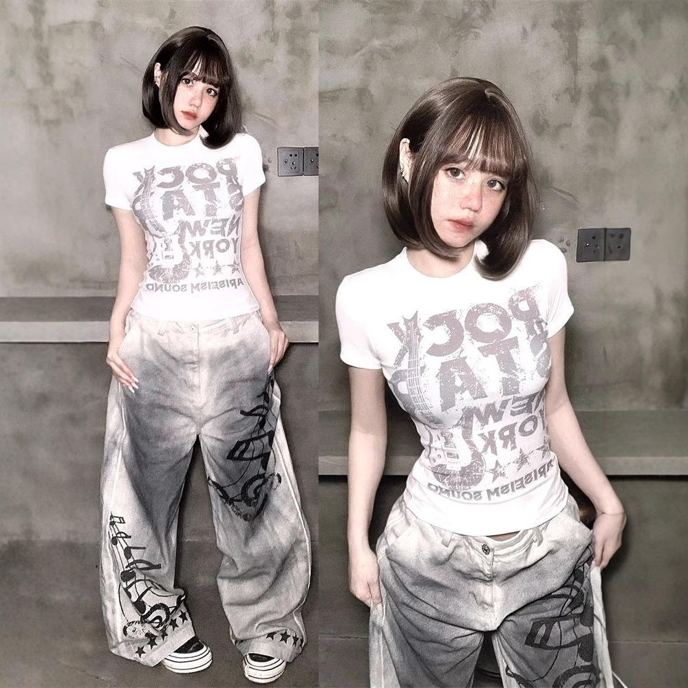 右肩Tシャツアメリカンレトロホットガールロックハイエンド右肩半袖Tシャツレディース夏新作タイトトッププリント