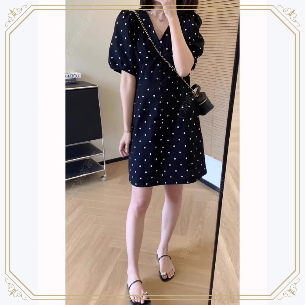 衣類 ヘップバーン風 通勤 年齢軽減 美しくスリムな黒水玉パフスリーブドレス レディース 夏 その他