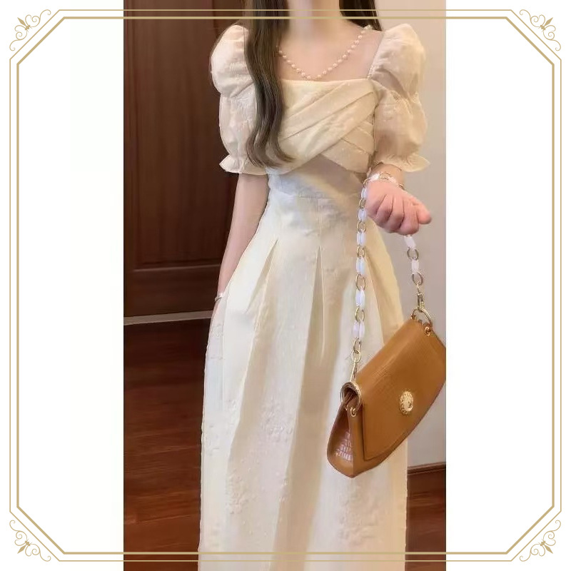 法式温柔一字肩方领两穿珍珠链连衣裙泡泡袖气质公主礼服长裙女装