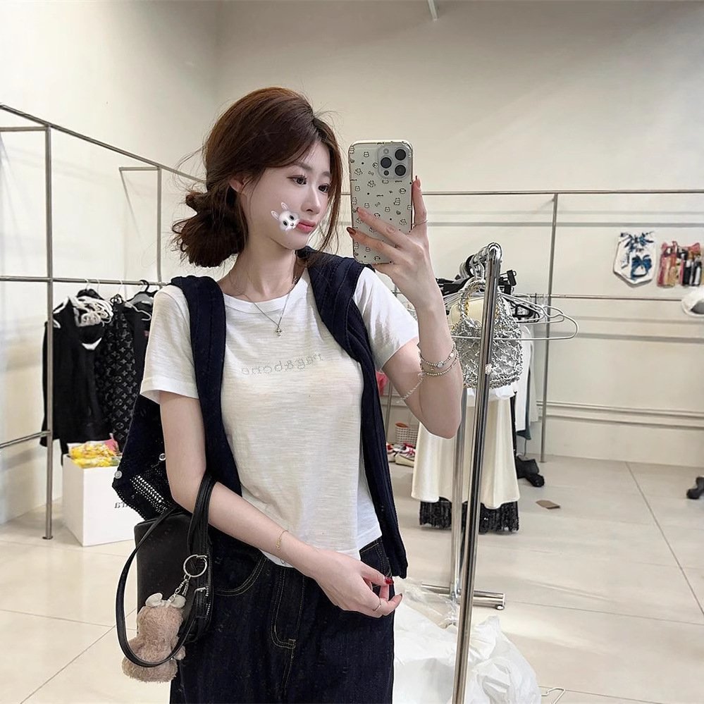 韓国風レターラインストーン半袖Tシャツレディース夏スリムフィット万能薄手スリムコットンショルダーショートトップトレンディ