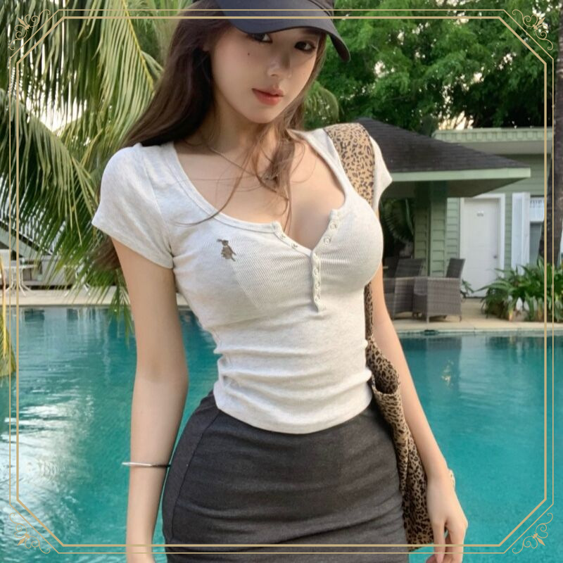 ベーシック刺繍Uネック半袖Tシャツレディース夏ピュアセクシーホットガールスリムグレーカジュアル万能ショートトップ