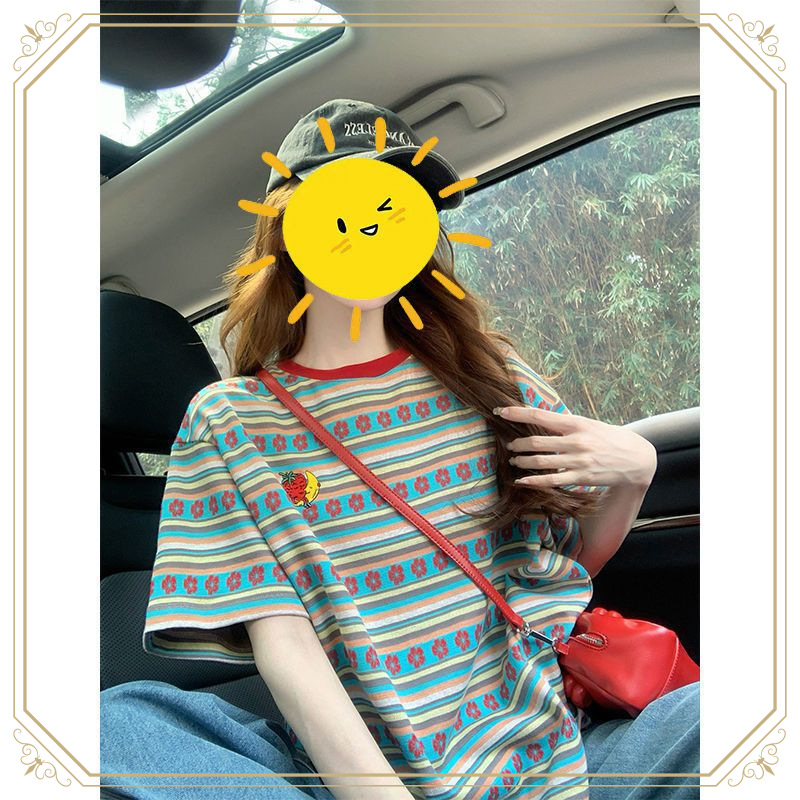 ストライプ半袖Tシャツ男女兼用大きいサイズ150kg夏新作韓国風年齢軽減デザインアメリカンレトロカップルトップス
