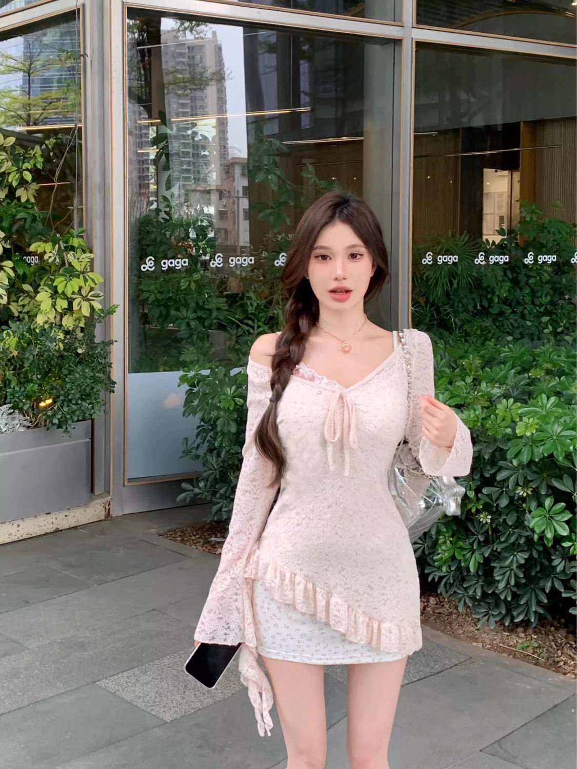 Pure Desire レースレース V ネック長袖ドレス女性の夏スリム不規則な A ラインスカートレイヤードウエストショートスカート