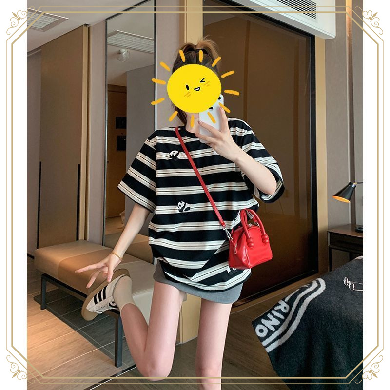黒ストライプパンダ刺繍半袖 Tシャツ男性と女性のための新しいルーズカジュアル特大サイズ 150kg カップルトップストレンディ