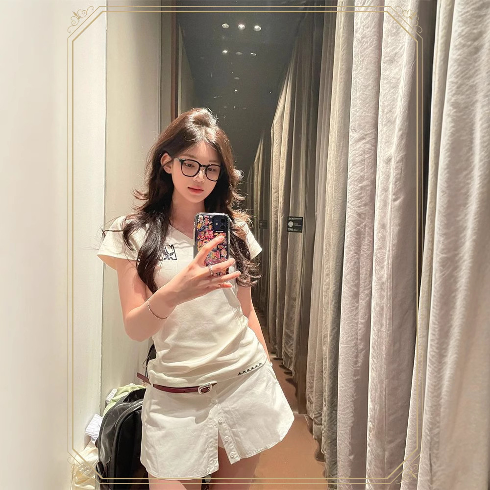 アメリカンレトロVネック刺繍ウエスト半袖ショルダーTシャツレディース夏甘辛万能スリムフィットショートトップ