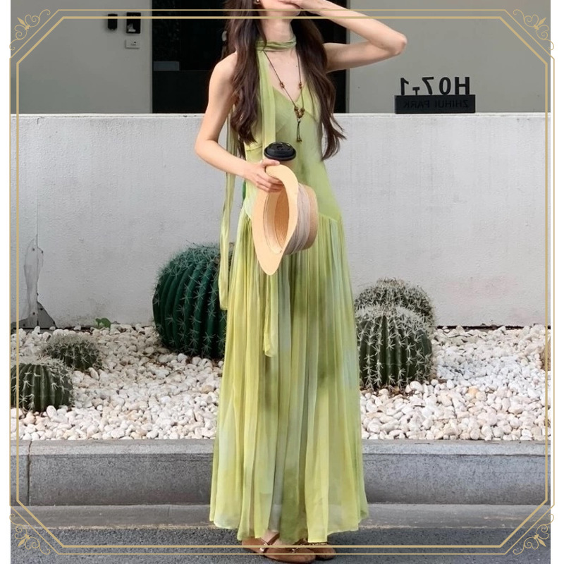 夏の美しいミニスカート、ドーパミンウェア、フレンチビーチバケーション、高級グリーンサスペンダーシフォンドレス